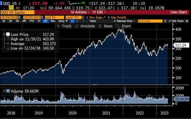 Furthermore, despite incessant media attention, the economy is more than just banks and commercial real estate. For example, there was recently a great news story about a promising Alzheimer’s drug trial from Eli Lilly. Indeed, the healthcare ETF IYH has been very resilient. Another sector with a great earnings story is technology. Much (both good and bad) has been written about the latest advances in artificial intelligence (AI), but the fact that these technologies are for real and that they will greatly boost productivity appears clear. This has not been lost on the market, as QQQ has had a massive rally so far in 2023.