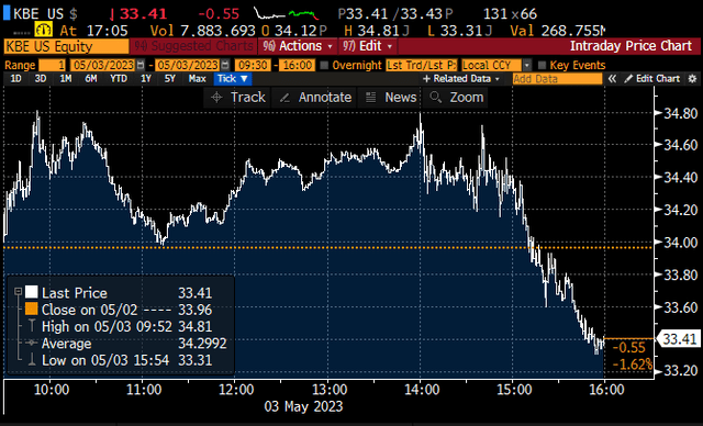 Stocks had been trading in the black on the day, but took a meaningful nosedive after 2pm, with the KBE bank ETF finishing the day down 1.6%. More on this momentarily.