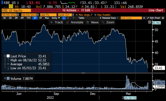 With competing safe investment options, like T-bills or money market funds, paying rates between 4.5-5%, banks need to pay more on deposits to prevent depositors outflows. If they don't do this, then deposits leave, forcing banks to reduce the asset side of the balance sheet. In either case, profitability suffers. May 3rd’s additional 25 basis point hike is not helping matters, as banks will need to pay yet more to keep their depositors from jumping to more attractive, safe options.