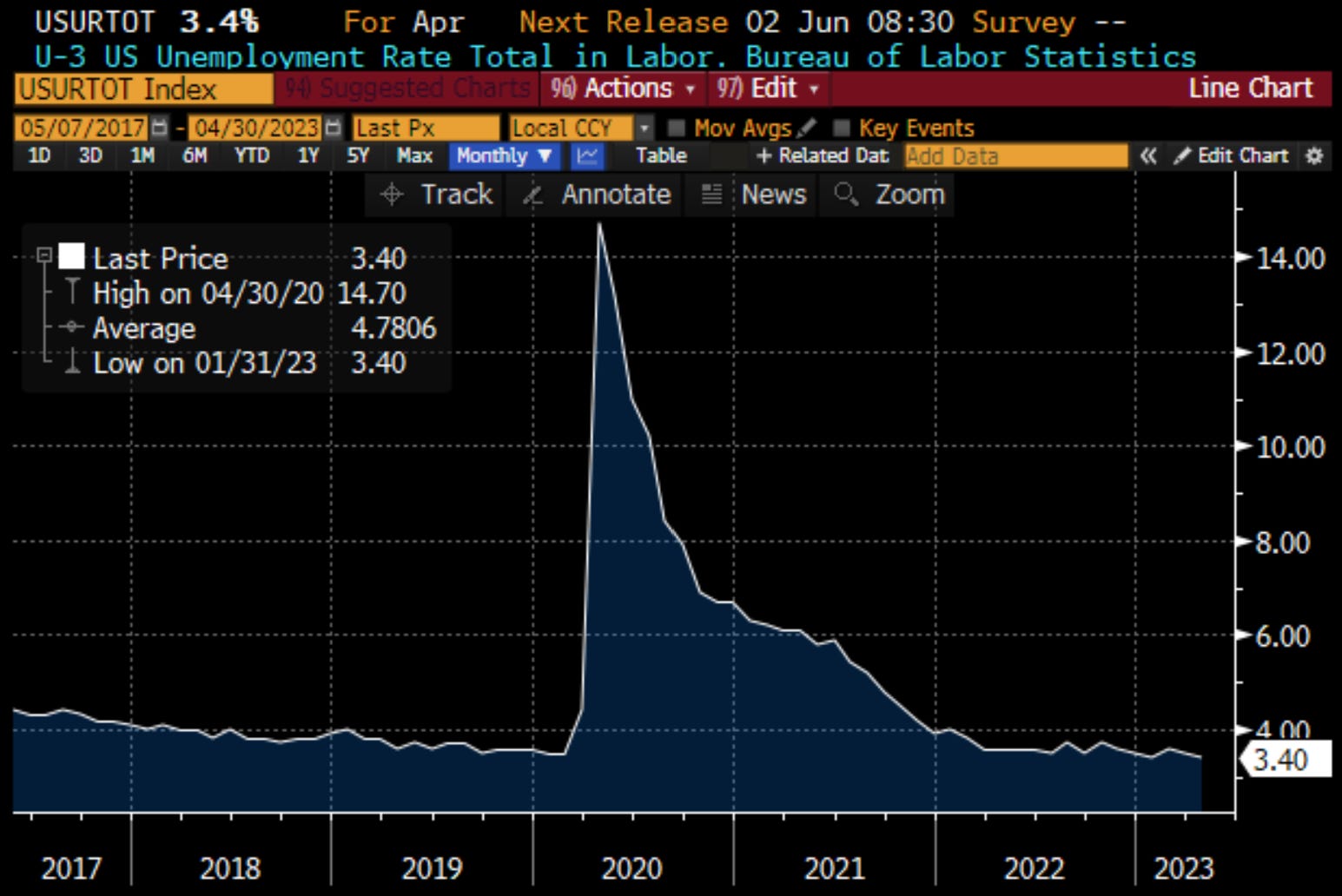 What is probably more concerning, from a purely inflation point of view, is the extraordinarily strong labor market in the U.S. After touching nearly 15% during the 2020 pandemic shutdown, the unemployment rate is now at 3.4%, and other measures of the job market are equally strong. If there is one prime focus of the Fed's inflation fears, it is the strong labor market.