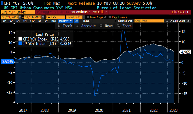 As has been the case for most of the last 18 months, the Fed is keeping an eye on economic growth and inflation. Headline inflation, after peaking close to 10% in mid-2022, is now sub-5% and apparently heading lower. Industrial production, after its large year-over-year post-COVID increase in 2021, is also headed lower. Both series are trending in a direction that policymakers concerned about inflation want to see.