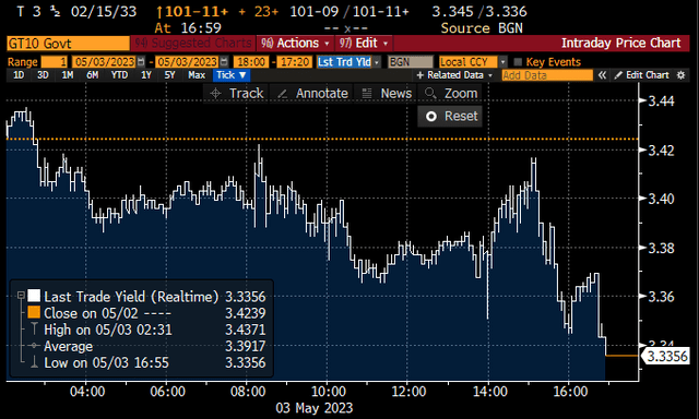 Despite the dovish tone of Powell's remarks and the fact that the Fed's 25 basis point rate hike was largely consistent with investor expectations, the market nevertheless reacted strongly after the announcement. The policy decision came out at 2pm at which point interest rates first increased — though that move was short-lived — and then fell with the 10-year Treasury yields ending the day about 9 basis points lower.