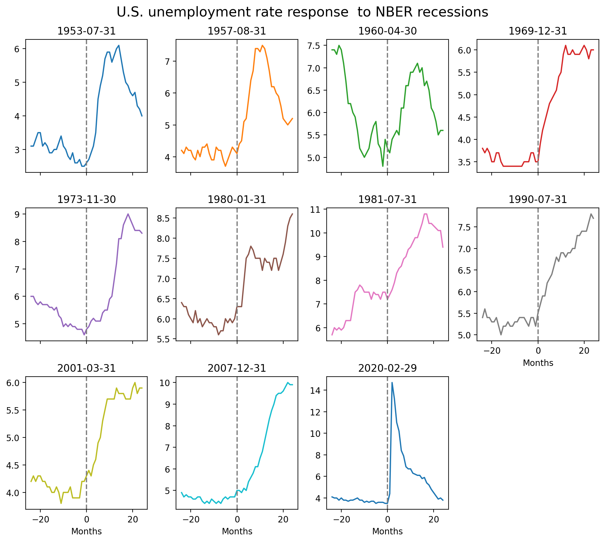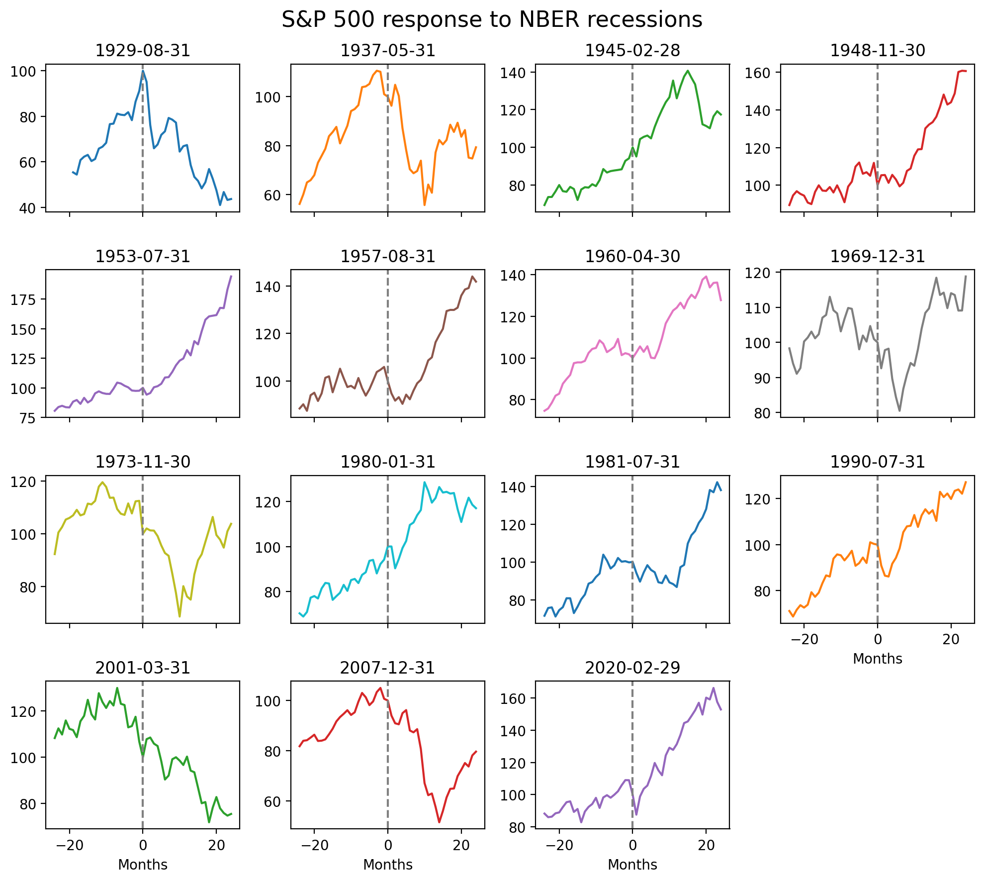 A quick note on terminology: The x-axis in the figure is labeled from -24 (24 months before the recession started) to +24 (24 months after the recession started). This [-24, -23, …, 23, 24] labeling is called event time to differentiate it from calendar time which is how we often look at stock prices.