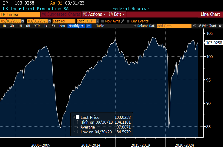 An important consideration is that the NBER identifies recession start dates only after the fact. They don’t tell you in real time that a recession has started. To connect the historical analysis to today, we therefore need to ask whether we are currently in a recession, or whether the oft-forecasted recession has yet to begin. The next chart shows the U.S. seasonally adjusted IP series (in levels, not in changes) normalized to a value of 100 in 2017.